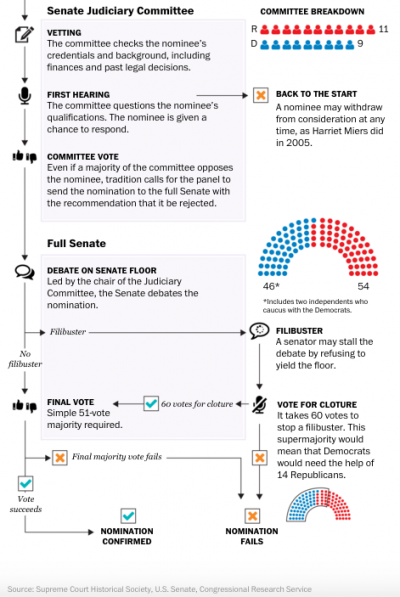 Suprema. Dopo la nomina presidenziale, la commissione Giustizia del Senato americano – attualmente in mano ai Repubblicani – si occupa di controllare la carriera e le passate decisioni del candidato, e di mettere ai voti la sua nomina. Il Washington Post ha fatto notare che al contrario del solito la commissione non ha in programma di assumere del personale aggiuntivo per aiutare quello della commissione ad esaminare la nomina di Garland. A prescindere dal risultato del voto, la discussione passa poi al Senato, dove attualmente i Repubblicani hanno una maggioranza di 8 voti sui Democratici (54 contro 46). Quasi sicuramente i Repubblicani avvieranno procedure di ostruzionismo, che potrebbe andare avanti per settimane. Per interromperle, ci vuole un voto di 60 senatori, e poi per ratificare la nomina di Garland saranno necessari “solamente” 51 voti. Di conseguenza, secondo i calcoli del Washington Post, i Democratici hanno bisogno di convincere 14 senatori, così da poter raggiungere i 60 voti necessari per aggirare i tentativi di ostruzionismo e poi votare agevolmente la nomina.