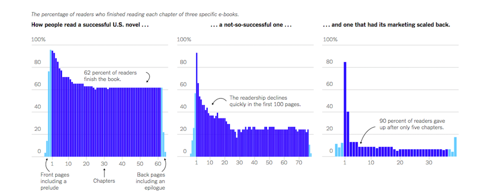 In questi grafici realizzati dal New York Times ci sono alcuni esempi delle analisi che Jellybooks realizza. Un romanzo che ha avuto successo negli Stati Uniti è stato letto per intero dal 62 per cento dei lettori che lo hanno iniziato, uno che ha avuto meno successo è stato abbandonato da più della metà dei lettori dopo le prime cento pagine. Un terzo la cui campagna pubblicitaria è stata ridimensionata dalla casa editrice è stato abbandonato dal 90 per cento dei lettori dopo soli cinque capitoli.