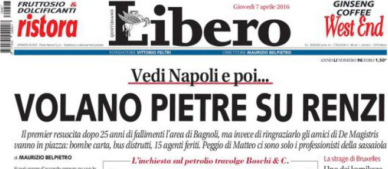 Ci sono notizie diverse in apertura sui giornali di oggi: molti titolano sugli scontri a Napoli fra la polizia e i manifestanti che contestavano il presidente del Consiglio Matteo Renzi, in città per presentare il piano di rilancio per l’area di Bagnoli, altri si occupano ancora dei contenuti delle intercettazioni nell’indagine della procura di Potenza che ha portato alle dimissioni del ministro dello Sviluppo economico Guidi, altri aprono con le dichiarazioni del presidente dell’Autorità anti corruzione Raffaele Cantone sulle tangenti nella sanità italiana, mentre il Manifesto titola sulle polemiche per la partecipazione del figlio di Totò Riina alla trasmissione di Bruno Vespa in RAI e l’Unità segue le indagini egiziane sulla morte di Giulio Regeni.