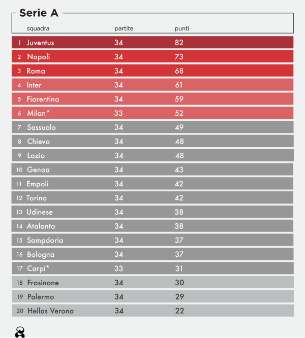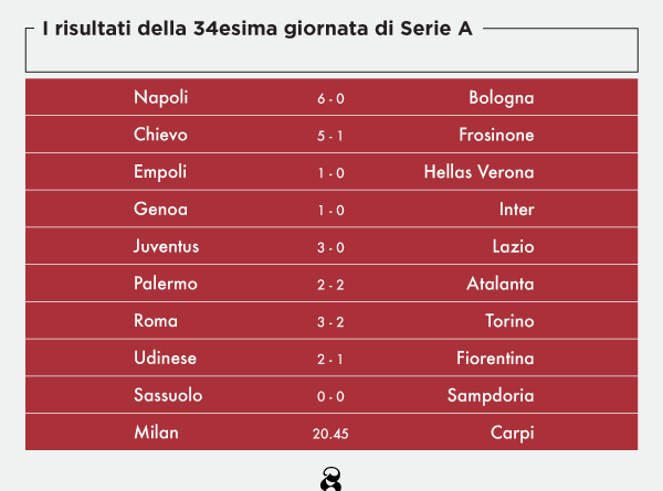 La 34esima giornata di Serie A si concluderà questa sera alle 20.45 con la partita tra Milan e Carpi: era iniziata martedì sera con Napoli-Bologna e ieri si sono giocate le altre otto partite. Sono successe molte cose e la classifica è cambiata, ma non nelle prime sei posizioni e nelle ultime tre. Da un paio di settimane inoltre si sa già con una certa sicurezza quale squadra vincerà il campionato.