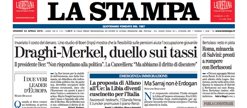 I principali quotidiani di oggi aprono sulla decisione della Banca Centrale Europea di lasciare invariati i tassi di interesse, nonostante le richieste della Germania di intervenire per rialzarli. Fanno scelte diverse il Giornale, che titola sulle divisioni nella maggioranza sulla legge sulla legittima difesa, il Fatto, che si occupa delle indagini sulla morte di Giulio Regeni, il Manifesto, che critica il governo per la legge sull’acqua pubblica, l’Unità, che apre sulle politiche europee per i migranti, e il Tempo, che segue le divisioni nel centrodestra sulla candidatura a sindaco di Roma.