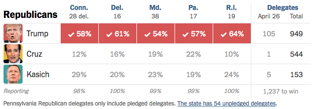 Trump ha vinto in tutti e cinque gli stati in cui si votava, ottenendo ovunque la maggioranza assoluta dei voti e vincendo 105 delegati contro soltanto uno di Ted Cruz, il suo principale sfidante, e cinque di John Kasich. Trump ha allargato così ulteriormente il vantaggio nei confronti dei suoi avversari, avvicinandosi alla soglia della metà più uno dei delegati di cui ha bisogno per ottenere la nomination alla convention del prossimo luglio a Cleveland: oggi ne ha 949, per essere sicuro della nomination deve arrivare a 1.237 entro la fine delle primarie. Cruz e Kasich matematicamente non possono più arrivare a 1.237: per questo da settimane ormai il loro unico obiettivo è evitare che ci arrivi Trump, e hanno annunciato una specie di alleanza per i prossimi stati in cui si vota.