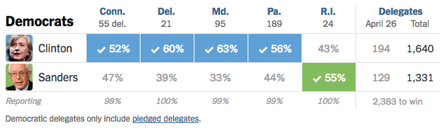 Tra i Democratici, invece, Hillary Clinton ha vinto in quattro stati su cinque, lasciando a Bernie Sanders la vittoria nel solo Rhode Island, il più piccolo e ininfluente tra gli stati che sono andati a votare. Il vantaggio di Clinton nel voto popolare e nel numero dei delegati è ormai praticamente incolmabile: oggi ne ha ottenuti 1.640 contro i 1.331 di Sanders (il triplo del vantaggio massimo che Obama ebbe su di lei alle primarie del 2008). Contando anche le scelte dei cosiddetti “superdelegati” – persone che partecipano di diritto alla convention per via dei loro incarichi istituzionali e nel partito, e possono votare chi vogliono – Clinton è a quota 2.159 delegati: deve arrivare a 2.383.