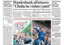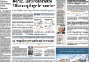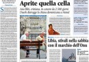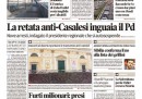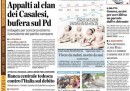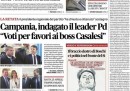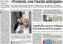 La notizia principale in apertura sui quotidiani di oggi è l’indagine in Campania sugli appalti che ha portato all’arresto di nove persone per corruzione e nella quale è indagato anche il presidente del Partito Democratico campano. La Stampa si occupa invece delle parole del presidente della banca centrale tedesca Weidmann, che ha criticato la Commissione UE per la mancanza di controlli sui conti dei vari paesi, il Manifesto e l’Unità aprono sulla decisione del parlamento inglese di bocciare un emendamento che prevedeva di accogliere tremila bambini rifugiati siriani, e il Messaggero titola sull’ipotesi allo studio di anticipare l’età della pensione.