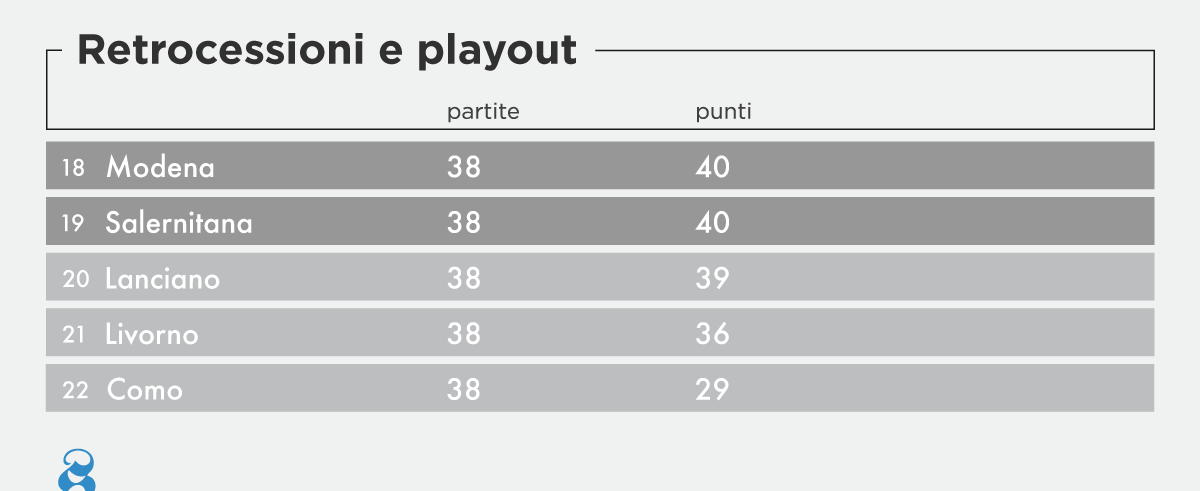 Nella zona retrocessione, il Como potrebbe essere matematicamente certo della retrocessione già sabato: da qui alla fine del campionato, può al massimo raggiungere i 41 punti. Se Modena, Salernitana e Latina, tutte ferme a 40 punti, dovessero vincere o pareggiare, il Como non avrebbe più speranze di salvarsi. Per le altre squadre in zona retrocessione si dovranno attendere le prossime giornate e la situazione potrebbe anche cambiare parecchio, così come per le squadre in zona playoff.