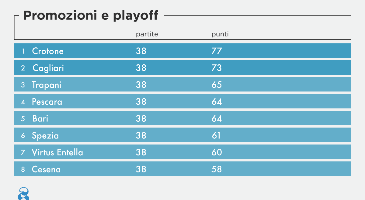Il Crotone giocherà domani contro il Modena e per ottenere la prima promozione in Serie A della sua storia gli basterà un punto: ma può ottenere la promozione anche se perde e il Trapani non vince contro il Novara. Il Cagliari invece, secondo in classifica, giocherà sabato contro il Livorno: per essere sicuro della promozione deve vincere o pareggiare e sperare nelle sconfitte di Trapani, Pescara e Bari. Il Trapani allenato da Serse Cosmi, nonostante l’impressionante serie di otto vittorie consecutive e dodici partite senza sconfitte, difficilmente riuscirà a superare il Cagliari nelle ultime quattro partite. Lo stesso discorso vale per il Pescara, squadra con una delle rose sulla carta più forti del campionato, che ora è quarta con 64 punti, uno in meno del Trapani.