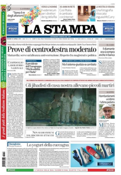 Sulla maggior parte dei giornali di oggi l’apertura è dedicata alla decisione di Guido Bertolaso di ritirare la propria candidatura a sindaco di Roma e alla scelta di Forza Italia di appoggiare Alfio Marchini come candidato sindaco. L’altra notizia presente su quasi tutte le prime pagine, e sulla quale aprono il Giornale e Libero, sono gli arresti in Lombardia di quattro persone accusate di terrorismo internazionale, che secondo l’accusa stavano progettando un attentato a Roma, mentre il Manifesto titola sulle manifestazioni in Francia contro la riforma del lavoro, Avvenire apre sulle parole del presidente della Repubblica Mattarella sulla corruzione, e l’Unità si occupa ancora della questione della recinzione e dei controlli al confine fra Italia e Austria.