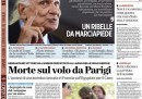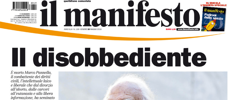 I giornali di oggi dividono le aperture fra le due notizie principali di ieri: la morte di Marco Pannella, ricordato su quasi tutte le prime pagine con grandi foto, e la scomparsa nel mar Mediterraneo del volo EgyptAir di ieri notte da Parigi al Cairo, per il quale i quotidiani sono propensi ad accettare l’ipotesi che si sia trattato di un attentato.