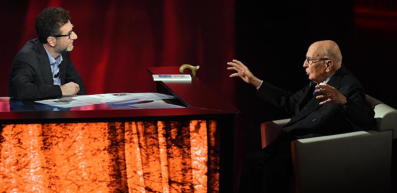 Giorgio Napolitano, presidente emerito della Repubblica Italiana, è stato ospite domenica sera della trasmissione di Rai3 Che tempo che fa, condotta da Fabio Fazio. Napolitano, che ha 90 anni, è stato presidente della Repubblica dal maggio 2006 al febbraio 2015 – è stato il primo presidente a essere rieletto per un secondo mandato – e con Fazio ha parlato della fatica di avere ogni giorno qualche decisione importante da prendere e dei privilegi che ha ritrovato dopo le sue dimissioni e l’elezione di Sergio Mattarella, come quello di fare delle passeggiate con sua moglie a Villa Borghese, il grande parco di Roma. Napolitano ha anche parlato del suo nuovo libro Europa, Politica e Passione e di cosa voglia dire far parte dell’Europa oggi, e ha discusso anche il referendum sulla riforma costituzionale del prossimo autunno dicendo che in caso di bocciatura della riforma il presidente del Consiglio Matteo Renzi «si troverebbe in una posizione difficilmente sostenibile».