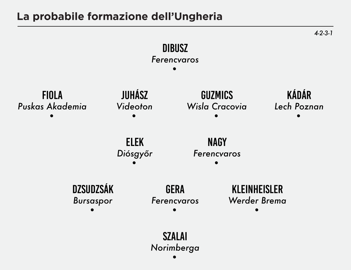 La formazione con cui l’Ungheria giocherà la prima partita dovrebbe essere simile a quella utilizzata nei gironi di qualificazione. Non sembra esserci un titolare fisso tra i portieri: il posto se lo giocheranno il promettente 25enne Dénes Dibusz, il portiere del Lipsia Péter Gulácsi e l’esperto Gabor Kiraly, che negli spareggi contro la Norvegia è risultato decisivo nonostante i suoi 40 anni (il nome potrebbe non dirvi niente, ma è quello che gioca da sempre con i pantaloni di tuta grigi, “i pantaloni del pigiama”).