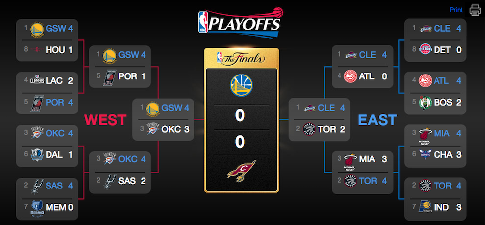 Cleveland e Golden State sono arrivate in finale in tempi e soprattutto con difficoltà diverse. Cleveland, inserita nella parte del tabellone della Eastern Conference, ha vinto tutte le partite dei playoff ad eccezione di due gare giocate in trasferta contro Toronto, in semifinale. Certo, come sottolineano esperti ed appassionati il livello della Eastern Conference è molto più basso rispetto a quello della Western Conference, ma Cleveland ha ottenuto comunque risultati eccellenti e soprattutto ha mostrato grandi miglioramenti rispetto alla stagione regolare. Golden State ha avuto un percorso molto più complicato: ha vinto abbastanza facilmente le prime due serie – contro Houston e Portland (entrambe per 4-1) – ma ha seriamente rischiato di essere eliminata nella serie contro gli Oklahoma City Thunder: era sotto 1-3, ha vinto tre partite di fila e ribaltato il risultato, come avevano fatto solo altre nove squadre nella storia della NBA.