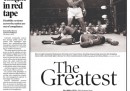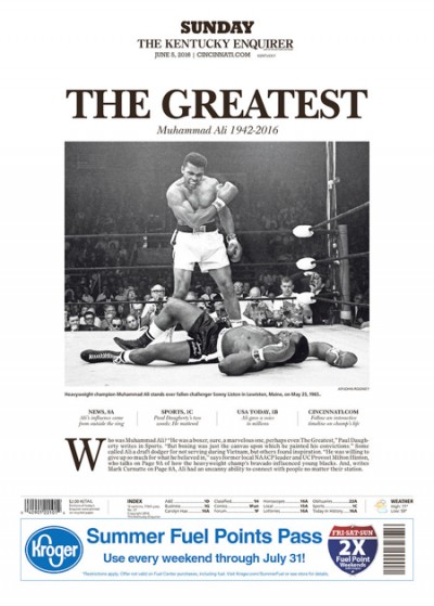 Ali inizialmente si chiamava Cassius Clay: nel 1965 cambiò nome, quando si convertì all’islam e aderì alla Nation of Islam, il movimento di Malcom X. Ali tra le altre cose si rifiutò di arruolarsi nell’esercito statunitense per andare a combattere in Vietnam: la sua scelta venne celebrata da alcuni e contestata duramente da molti altri. Per queste e molte altre cose, Ali fu una delle figure più carismatiche del Novecento negli Stati Uniti, e di conseguenza in tutto il mondo. È per questo che dal suo paese natale di Louisville, in Kentucky, fino alla Nuova Zelanda, praticamente ogni giornale gli ha dedicato prime pagine e lunghi articoli: la maggior parte delle volte usando la parola “Greatest”, il più grande, uno dei soprannomi di Ali. E molti giornali hanno scelto la foto più famosa di Ali, quella dell’incontro con Sonny Liston, che ha una bella storia.