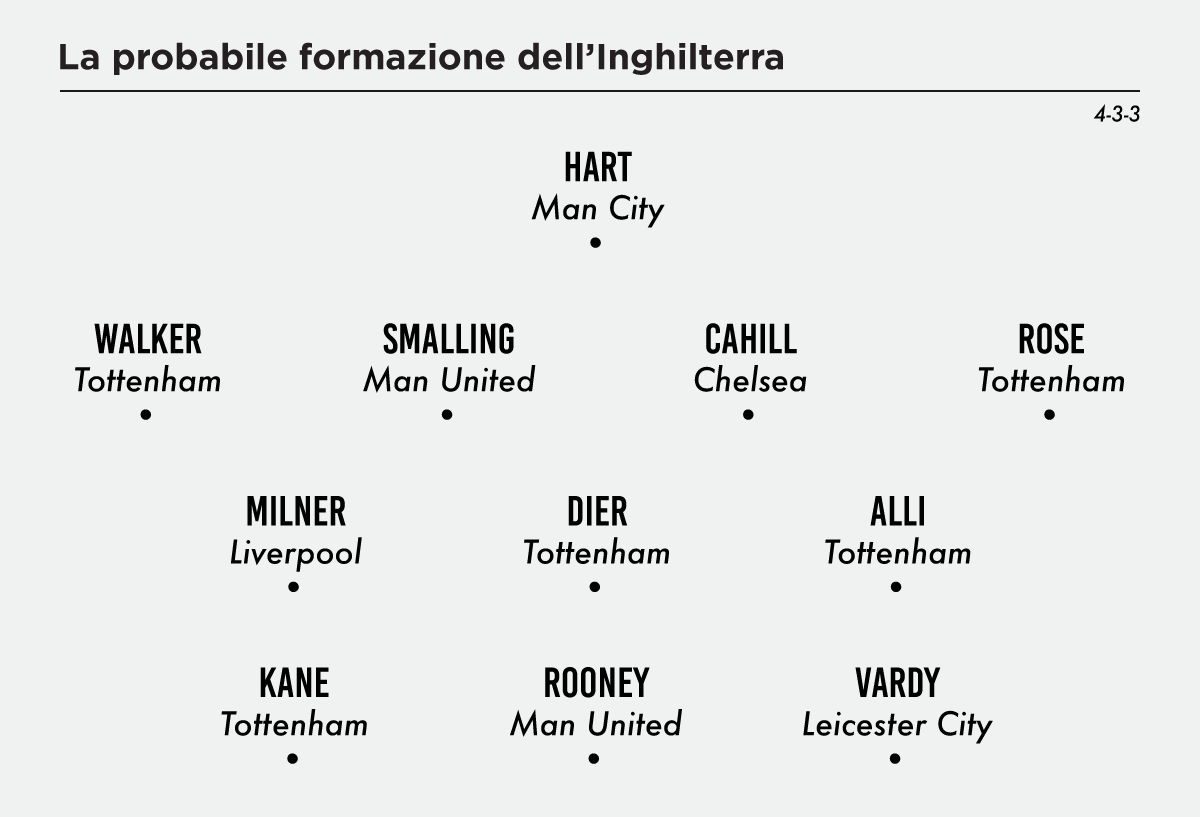 Il problema principale per Hodgson è capire come far convivere in campo i tre attaccanti: Rooney, Kane e Vardy. Gli ultimi due sono i migliori del campionato inglese, mentre Rooney è quello con più esperienza e Hodgson lo stima molto e lo considera tatticamente prezioso. Potrebbe stare fuori dalla formazione titolare invece Raheem Sterling, velocissima ala del Manchester City, escluso da un gioco che non prevede veri esterni d’attacco. In porta, difesa e centrocampo non ci sono particolari problemi e non dovrebbero esserci nemmeno in caso di squalifiche o infortuni, visto la qualità delle riserve.