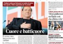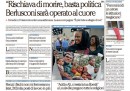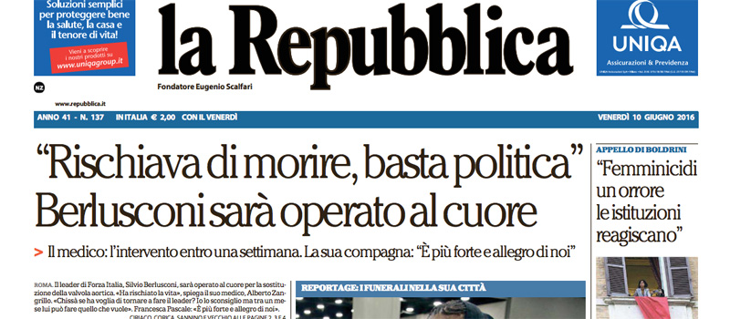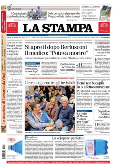 La maggior parte dei quotidiani di oggi titola sulle condizioni di salute di Silvio Berlusconi, dopo l’annuncio di ieri da parte del suo medico che sarà operato al cuore e che ha rischiato di morire per lo scompenso cardiaco che lo ha colpito qualche giorno fa. Hanno aperture diverse il Corriere della Sera, che apre con un’intervista al presidente del Consiglio Renzi sui ballottaggi e sull’azione del governo, il Sole 24 Ore e il Fatto, che commentano l’approvazione al Senato del decreto sulle banche fallite, Avvenire, che si occupa dell’intervento di Renzi all’assemblea di Confcommercio, l’Unità, che titola sui nuovi dati ISTAT sull’occupazione, e il Manifesto, che apre sugli scioperi in Francia in concomitanza con la partenza degli Europei di calcio, evento sul quale titolano i quotidiani sportivi occupandosi naturalmente degli aspetti sportivi.