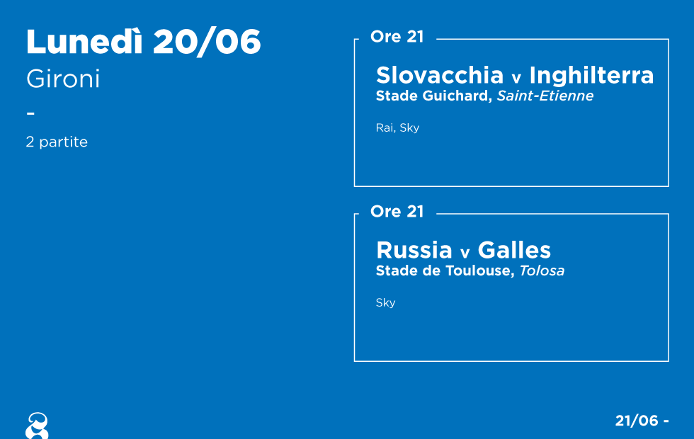 Sono le ultime del gruppo B, Slovacchia-Inghilterra e Russia-Galles: si giocheranno in contemporanea alle 21, e tutte e quattro le squadre hanno la possibilità di passare il turno