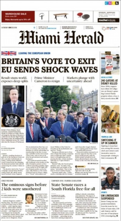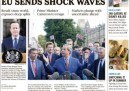 Da venerdì mattina la notizia principali su tutti i siti del mondo è il risultato del referendum sull’uscita del Regno Unito dall’Unione Europea, in cui a sorpresa ha vinto “Brexit”, cioè l’opzione sostenuta dai favorevoli al “Leave” (il Post segue le notizie su Brexit con un liveblog). Dato che il risultato è stato comunicato ufficialmente la mattina di venerdì, quasi tutti i giornali usciti ieri non hanno fatto a pubblicare la notizia (alcuni in Italia hanno addirittura titolato sulla vittoria dei “Remain”, sulla base di alcuni sondaggi che si sono rivelati sbagliati). Sabato 25 giugno invece le prime pagine dei giornali di tutto il mondo si sono concentrate su “Brexit”, con toni simili quasi ovunque: soprattutto dubbi e incertezze – più o meno allarmistici – sul futuro della UE e in generale dell’economia mondiale (qui abbiamo provato a mettere insieme qualche scenario plausibile). L’atteggiamento generale più diffuso sembra essere cautamente critico, salvo qualche eccezione: l’Irish Times ad esempio chiama la decisione dei cittadini britannici: «Un incredibile atto di autolesionismo».