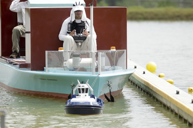 Simulazione con un rimorchiatore e una nave in miniatura, maggio 2016 (AP Photo/Arnulfo Franco)