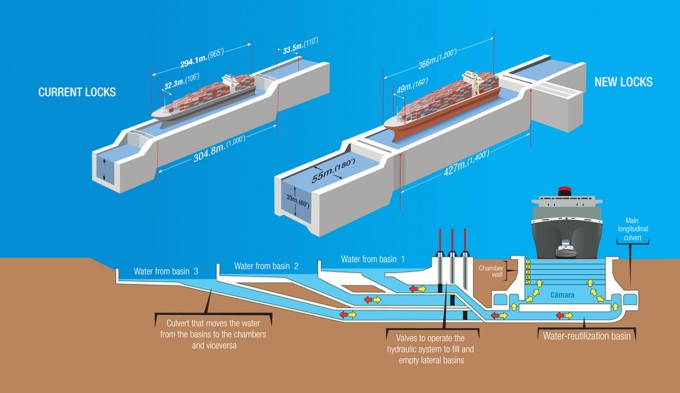 Il Canale in origine aveva due corsie. Il progetto di espansione che è stato iniziato nel 2009 prevedeva un nuovo canale che si affiancasse al primo, formato da due nuove chiuse composte ciascuna da tre blocchi (o camere): una sul lato dell’Atlantico e una sul lato del Pacifico. Queste chiuse avrebbero permesso il sollevamento delle navi dal livello degli oceani al lago Gatún (che è tra i due oceani) e viceversa, in un tempo previsto inferiore alle due ore. Ognuna delle camere che formano ciascuna chiusa sarebbe stata larga 55 metri, lunga circa 426 metri, profonda da 23 a 33 metri, e con un sistema di paratie scorrevoli in senso orizzontale che avrebbe consentito di superare il dislivello di circa 27 metri tra gli oceani e il lago. Per posizionare le navi il progetto prevedeva l’uso di rimorchiatori al posto delle locomotive usate in precedenza.