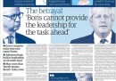 Le prime pagine dei giornali britannici di oggi si occupano tutte della decisione di Boris Johnson, l’ex sindaco di Londra, di rinunciare alla candidatura per la guida del partito Conservatore. Johnson aveva sostenuto il Leave ed era considerato da anni rivale di Cameron per la guida del partito, quindi oggi il meglio posizionato per succedergli. La sua rinuncia è arrivata un paio d’ore dopo un altro annuncio a sorpresa, questa volta da parte del ministro della Giustizia conservatore Michael Gove, che si è candidato per la leadership del partito dopo avere detto per giorni che avrebbe sostenuto la candidatura di Johnson.