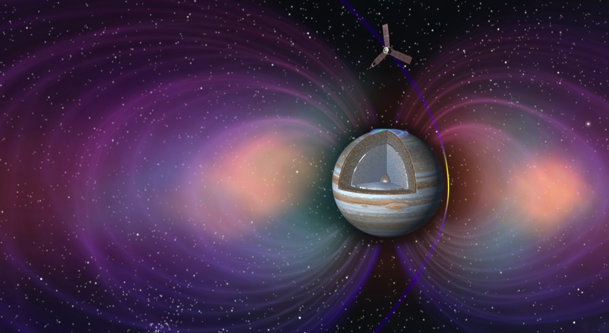 Giove ha un campo magnetico molto potente, che secondo gli astronomi si origina in profondità nel pianeta, a circa un terzo del raggio, dove la pressione e così alta da rendere liquido l’idrogeno, che si comporta come un metallo diventando un grande conduttore di elettricità. È in questo enorme oceano di idrogeno liquido che si produce il campo magnetico, complice la veloce rotazione del pianeta: è 20mila volte più intenso di quello della Terra e occupa un’ampia porzione di Spazio (magnetosfera), che si estende fino a 3 milioni di chilometri, con una coda che si prolunga per quasi un miliardo di chilometri: per le strumentazioni di una sonda, come Juno, può essere un inferno, per questo alcune sono state schermate con spessi involucri in titanio.