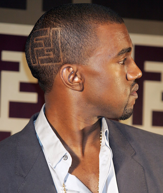 Kanye West con una rasatura a forma del logo di Fendi in occasione della presentazione della sua collaborazione con la casa di moda romana per la primavera-estate 2007, il 30 novembre 2006, a Tokyo (Photo by Junko Kimura/Getty Images)