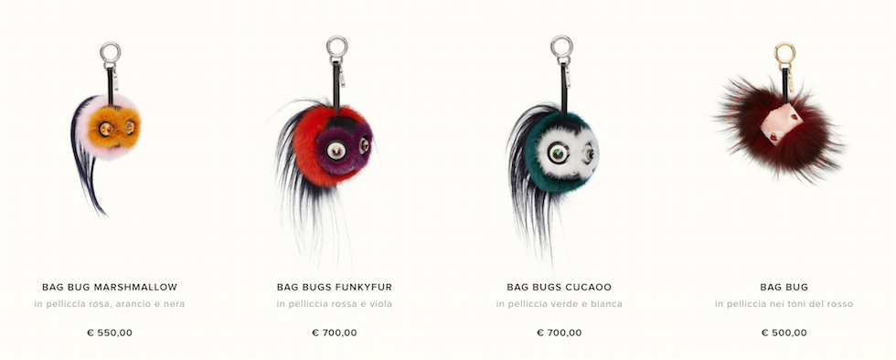 Negli ultimi anni il più grande successo di Fendi sono i bag charm, letteralmente “gioielli da borsa”, accessori con l’unica utilità di decorare le borse; in pratica sono un’evoluzione dei portachiavi di lusso. Quelli di Fendi sono palle di pelliccia, spesso colorata con tinte sgargianti, e possono costare fino a un migliaio di euro. Alcuni sono di un unico colore, altri hanno una lettera stampata sopra, ma quelli più particolari hanno degli occhi: sono i “Bag Bug” (letteralmente “insetti da borsa”), gli addetti ai lavori li chiamano anche “mostri di pelliccia”. Alcuni hanno anche le caratteristiche fattezze di Karl Lagerfeld: codino bianco e occhiali scuri.