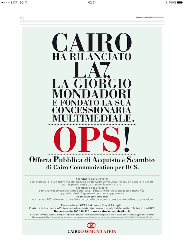 Oggi Cairo Communications ha comprato una pagina sul Corriere della Sera, per pubblicizzare la sua opas.