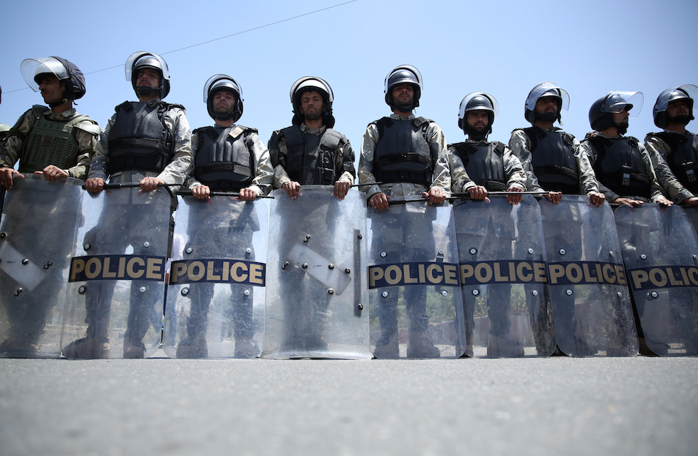 Poliziotti afghani alla manifestazione prima dell’esplosione (AP Photos/Massoud Hossaini)