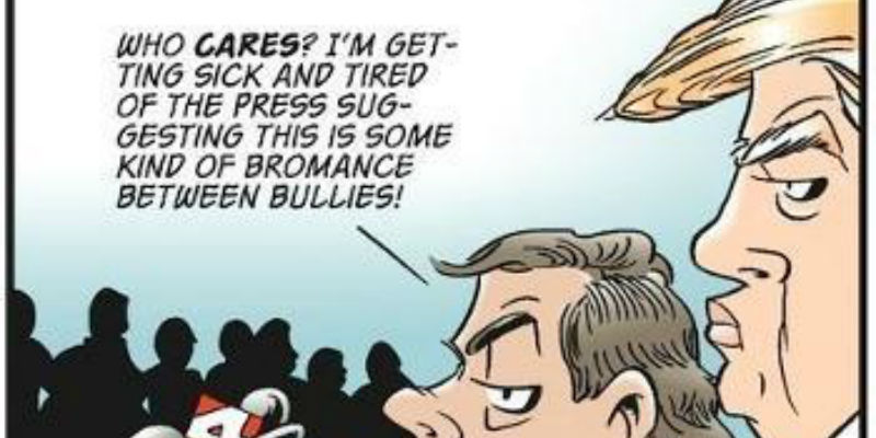 GT: Grazie, ma hai ragione. All’inizio fu l’insaziabile fame di attenzione di Trump a mettere le basi, per quanto sgradite. È sempre stato impossibile da ignorare. È come avere un grosso campanaccio chiassoso fisso in testa. Ho appena fatto quattro strisce domenicali di fila su Trump: è una cosa assurda. Ho decine di altri personaggi e di archi narrativi da scrivere, e molte altre cose di cui parlare. Ovviamente, i commentatori di tutte le strisce hanno avuto lo stesso problema.