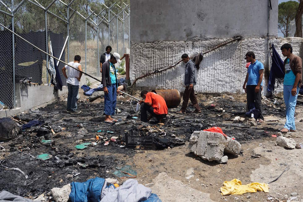Alcuni migranti nel campo profughi di Moria, dopo uno scontro tra pakistani e afghani, il 2 giugno 2016 (STR/AFP/Getty Images)