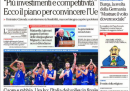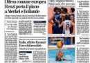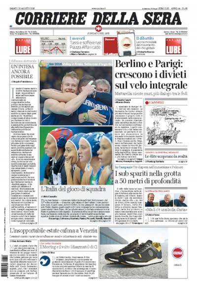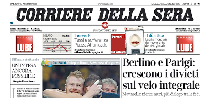 Sulle prime pagine di molti giornali di oggi compare il discorso del presidente della Repubblica Sergio Mattarella al Meeting di Rimini di Comunione e LIberazione. La parte più citata è quella in cui Mattarella chiede una maggiore apertura nei confronti dei migranti. Diversi altri giornali raccontano della proposta del governo tedesco di vietare parzialmente il velo nei luoghi pubblici. I giornali sportivi parlano della storica qualificazione della nazionale maschile di pallavolo alla finale olimpica e delle prime partite di Serie A di calcio, che inizia oggi con Roma-Udinese e Juventus-Fiorentina.