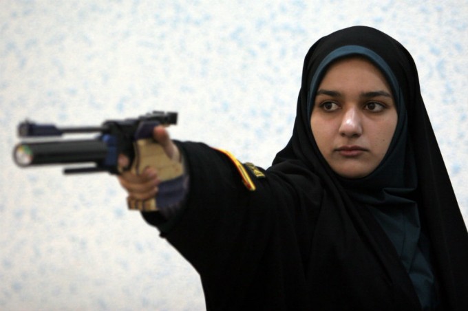 Un’agente di polizia iraniana durante un sessione di tiro a segno (AP Photo/Vahid Salemi)