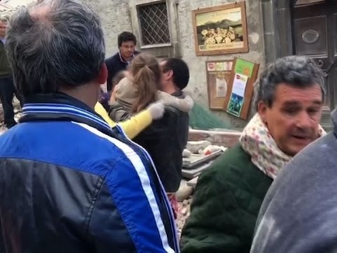 Il salvataggio di alcune persone rimaste intrappolate nelle macerie questa mattina ad Amatrice.