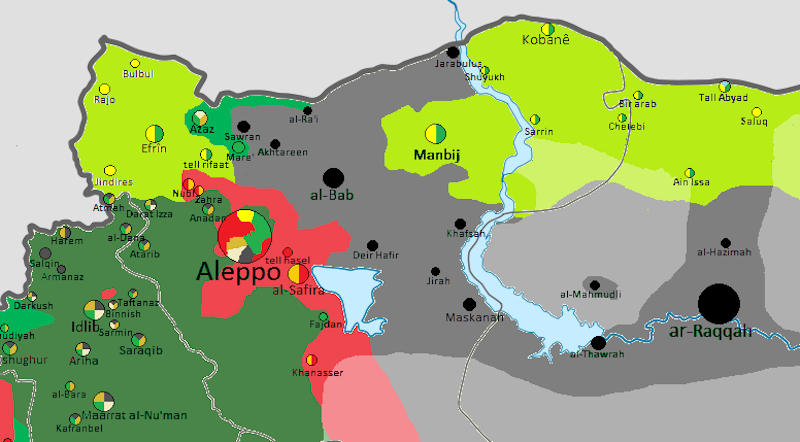 Breve spiegazione di chi sta con chi, almeno fino a oggi e semplificando un po’. Da una parte c’è il regime siriano di Bashar al Assad, alleato con l’Iran, la Russia e le milizie sciite libanesi di Hezbollah. Dall’altra ci sono i ribelli che combattono Assad, che sono alleati della Turchia e che includono sia fazioni moderate – alcune delle quali alleate con gli Stati Uniti – sia gruppi estremisti e jihadisti, come Jabhat Fateh al Sham (prima conosciuta come Jabhat al Nusra, la divisione siriana di al Qaida). Poi ci sono altre due parti principali: c’è lo Stato Islamico, che non è alleato con nessuno, e ci sono i curdi siriani, che fanno parte di una coalizione sostenuta dagli Stati Uniti. In linea di massima si potrebbe dire che questi quattro schieramenti combattono uno contro l’altro, anche se il discorso è molto più complicato di così. Sono arcinemici Assad e i ribelli, che negli ultimi mesi si combattono soprattutto nella provincia di Aleppo, nel nord-ovest della Siria; sono altrettanto arcinemici la Turchia e i curdi siriani, i quali sono strettamente legati ai curdi turchi del PKK, storici nemici del governo turco. Lo Stato Islamico combatte intensamente sia contro i curdi siriani che contro i ribelli.