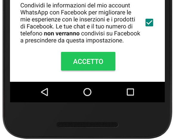 La condivisione dei dati con Facebook è una questione abbastanza grossa: implica che due società diverse, per quanto una appartenga all’altra, si scambino dati sensibili sui loro utenti per migliorare il loro servizio. Facebook, per esempio, potrà avere accesso alle liste di amici e contatti di WhatsApp e usare queste informazioni per suggerire nuovi amici ai suoi utenti e targettizzare meglio la sua pubblicità o offrire nuovi servizi alle aziende (per esempio la possibilità di avvertire più tempestivamente i suoi clienti di qualche novità). Facebook, inoltre, potrà avere accesso al numero di telefono usato da ogni utente per registrarsi su WhatsApp e a informazioni sull’utilizzo dell’app (per esempio l’ultima volta che si è eseguito l’accesso). La condivisione dei dati non segue comunque nessun cambiamento a livello organizzativo o societario: Facebook e WhatsApp continueranno per tutti gli altri aspetti a essere gestite in modo autonomo e separato e WhatsApp continuerà a non vendere pubblicità come fatto fin qui.