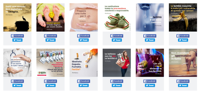 Le “cartoline” condivisibili sui social sul Fertility Day, con slogan molto criticati come “la fertilità è un bene comune”, “datti una mossa, non aspettare la cicogna!”, “Sballato. Dopato. Fumato. Fertile?”