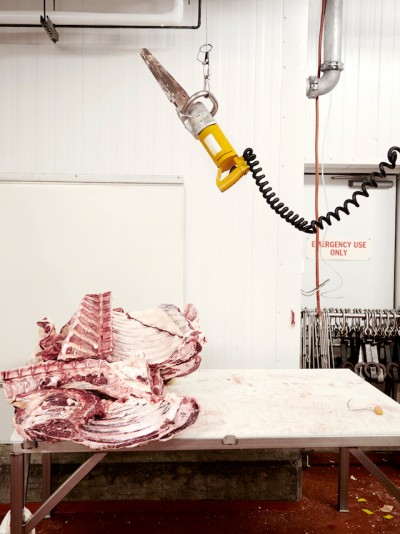 La Vermont Packinghouse è un impianto di macellazione con sede a North Springfield, nel Vermont, nel nord-est degli Stati Uniti. Ci lavorano circa 50 persone, esiste da due anni – prima c’era una ditta di gelati – e ha la particolarità di essere uno dei pochi macelli al mondo a essere completamente aperti al pubblico: basta chiamare, decidere un orario e viene organizzata una visita guidata all’interno dell’impianto di macellazione. Arian Thiboumery, che gestisce la Vermont Packinghouse, ha detto allo Huffington Post: «Ci sentiamo orgogliosi di quello che facciamo qui e vogliamo che tutto sia alla luce del sole. Vi descriveremo il modo in cui gli animali sono stati allevati e come sono morti. Non ce ne vergogniamo». La cosa ha attirato anche l’attenzione di Everett Meissner, un fotografo di New York che ha anche una casa nel Vermont: si è messo in contatto con Thiboumery e ad aprile ha scattato alcune fotografie all’interno della Vermont Packinghouse.