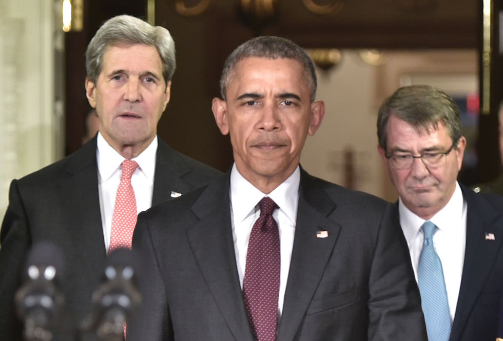Il presidente Barack Obama, alla sua destra il segretario di Stato John Kerry e alla sua sinistra il segretario della Difesa Ashton Carter, a una conferenza stampa a Washington, il 25 febbraio 2016 (MANDEL NGAN/AFP/Getty Images)