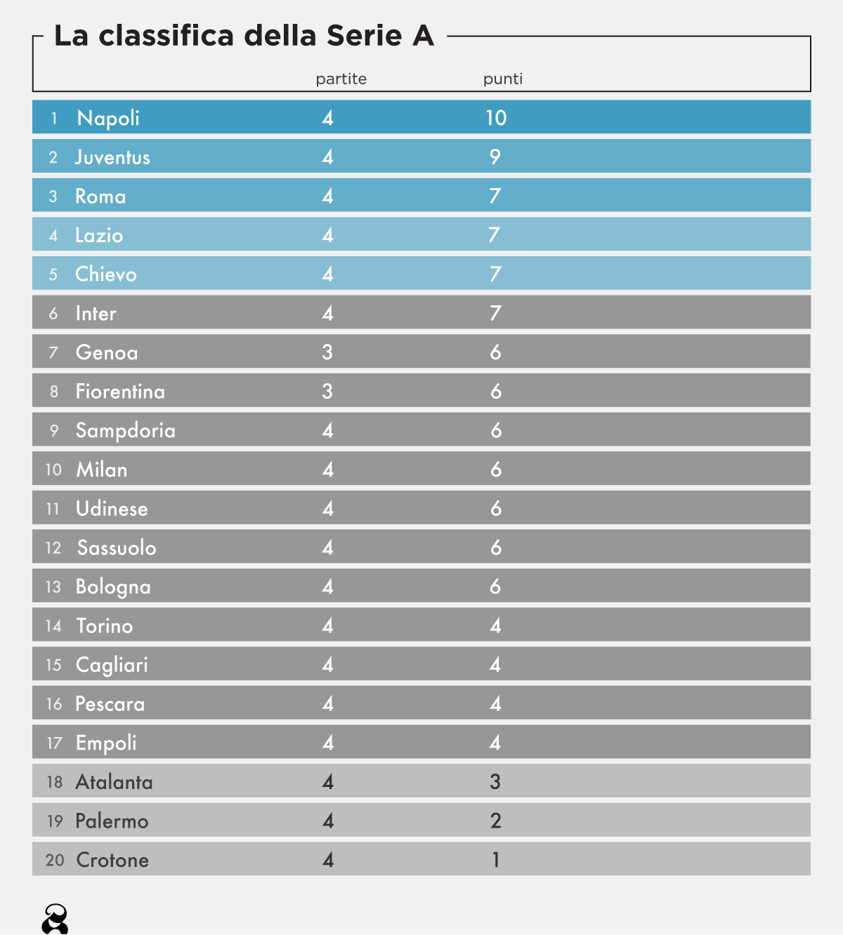 Tutte e venti le squadre di Serie A sono distanziate da pochi punti, che da questa giornata però inizieranno a essere sempre di più, soprattutto tra le ultime e le prime. Grazie alla vittoria di venerdì sera, il Milan si è portato a sei punti, evitando ulteriori critiche dopo la sconfitta in casa contro l’Udinese di domenica scorsa. Fiorentina e Genoa hanno una partita in meno delle altre perché l’incontro della settimana scorsa è stato interrotto dopo venti minuti di gioco a causa del maltempo: la partita verrà recuperata il 15 dicembre. Il Napoli, dopo la sconfitta della Juventus, si trova momentaneamente primo in classifica con dieci punti. Il Sassuolo invece, senza la partita persa a tavolino 3 a 0 contro il Pescara, ora avrebbe gli stessi punti della Juventus.