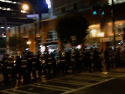 Le proteste tra mercoledì e giovedì sono state nel complesso piuttosto violente. Alcuni manifestanti hanno lanciato diversi oggetti contro la polizia, compresi alcuni vasi di terracotta dell’arredo urbano, nel quartiere finanziario della città. Altri hanno rotto le vetrine di alcuni negozi e locali, danneggiando gli interni e compiendo qualche furto. Gli agenti hanno risposto con il lancio di fumogeni e hanno marciato lentamente contro i manifestanti, cercando di fermarli e di disperderli. Le due parti hanno perso e riguadagnato terreno per diverse ore nella notte, poi sono aumentati gli scontri con il lancio da parte dei manifestanti di bottiglie di vetro, almeno una molotov e altri oggetti. La polizia ha risposto sparando alcuni colpi a salve che ha fatto temporaneamente disperdere parte dei manifestanti.