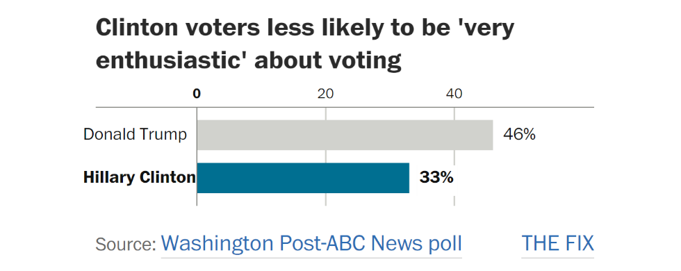 Al di là della prevedibile faziosità degli elettori, c’è poi il problema dell’affluenza e di quale candidato riuscirà a convincere i suoi sostenitori ad andare a votare. In questo caso, avere entusiasmo aiuta: ora come ora, potrebbe averne di più Trump. Un recente sondaggio condotto questo mese dal Washington Post e da ABC News mostra che il 46 per cento dei sostenitori di Trump era «molto entusiasta» all’idea di andare a votare, mentre quelli di Clinton che dicevano altrettanto sono stati solo il 33 per cento. Il 93 per cento dei sostenitori di Trump, inoltre, ha detto di essere sicuro di andare a votare a novembre, contro l’80 per cento di quelli di Clinton.