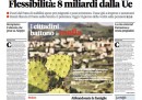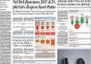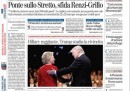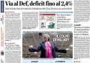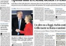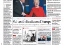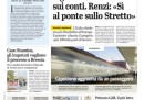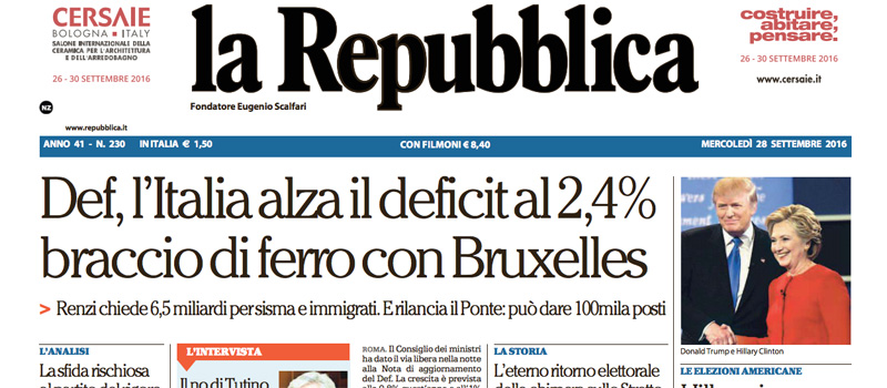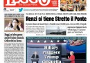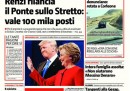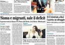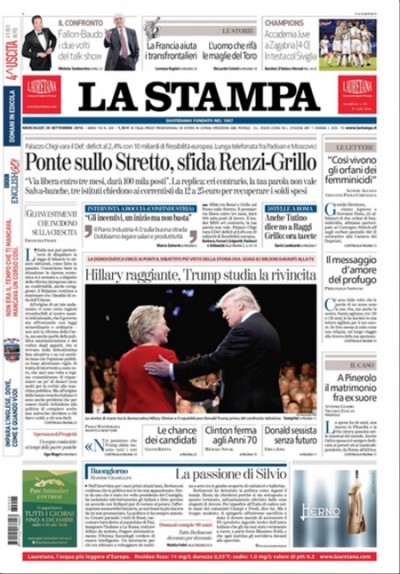 La maggior parte dei quotidiani di oggi titola sull’approvazione da parte del Consiglio dei ministri dell’aggiornamento del Documento di economia e finanza, che prevede di portare il deficit fino al 2,4% per le spese per il terremoto e per l’accoglienza dei migranti; l’altra notizia sulla quale aprono diversi giornali è l’annuncio del presidente del Consiglio Renzi di voler far ripartire il progetto del ponte sullo stretto di Messina, mentre il Corriere della Sera si occupa del confronto di ieri notte fra Clinton e Trump, il Giornale apre sulla decisione di tre banche di chiedere un contributo ai correntisti per finanziare le spese del decreto salva banche, e Libero e il Tempo festeggiano l’ottantesimo compleanno di Silvio Berlusconi, che è domani. I quotidiani sportivi celebrano la vittoria della Juventus, che ha battuto 4-0 la Dinamo Zagabria in Champions League.