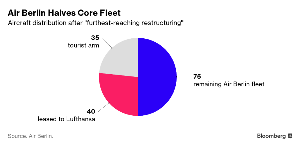 Air Berlin ha detto che alcuni dei suoi dipendenti che perderanno il lavoro potrebbero essere trasferiti in altre compagnie aeree in cui Etihad detiene una quota, mentre altri potrebbero essere licenziati definitivamente. La società, che ha perso circa il 94 per cento del suo valore dalla sua prima quotazione in borsa del 2006, discuterà anche con i sindacati dei piloti e degli equipaggi per cercare di trovare un accordo su contratti di lavoro «economicamente più vantaggiosi» per il resto del personale. Tutto il personale amministrativo sarà raggruppato a Berlino, mentre per il settore turistico la società sta valutando alcune «opzioni strategiche». Le operazioni della compagnia principale saranno concentrate a Berlino e Düsseldorf, ma ci saranno basi anche a Monaco e Stoccarda. Air Berlin manterrà 17 aerei Airbus A330 a fusoliera larga per i voli a lunga tratta, che continuerà a coprire. Gli aerei a fusoliera stretta saranno invece noleggiati a Lufthansa, che li userà per ampliare la flotta della sua compagnia aerea low-cost Eurowings, a cui saranno aggiunti 35 aerei che ne aumenteranno così la sua flotta di oltre un terzo. La compagnia aerea Austrian Airlines, sempre di proprietà di Lufthansa, riceverà i restanti cinque aerei per ampliare le sue operazioni a Vienna.