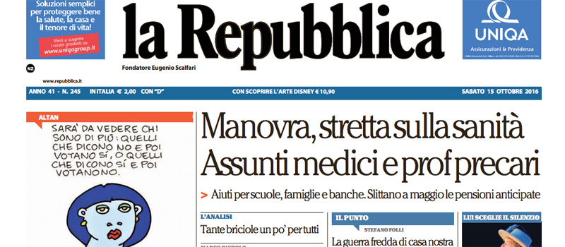 Quasi tutti i giornali si occupano in apertura della legge di bilancio che sarà esaminata oggi dal Consiglio dei ministri: i punti sui quali si concentrano i titoli dei quotidiani sono la manovra sulle pensioni che consentirà di anticipare l’età pensionabile, i tagli alla sanità, le nuove assunzioni di medici e nella scuola, e gli sgravi per favorire l’occupazione di giovani. Il Giornale apre invece sull’operazione NATO in Lettonia nella quale saranno schierati anche militari italiani nel 2017, mentre Libero attacca le politiche sull’accoglienza dei migranti.