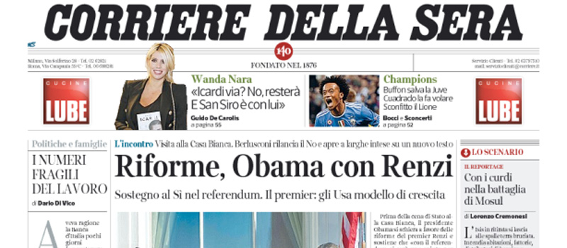 Quasi tutti i giornali di oggi aprono sull’incontro a Washington fra il presidente del Consiglio Matteo Renzi e il presidente degli Stati Uniti Barack Obama, durante il quale Obama ha appoggiato la riforma costituzionale sulla quale si esprimerà il referendum del 4 dicembre e ha chiesto all’Italia un maggiore impegno per la soluzione della crisi in Libia. Repubblica e il Giornale titolano sulla manovra economica, il primo anticipando il richiamo dell’Unione Europea, il secondo sulla norma per il rientro in Italia del denaro contante, Avvenire e l’Osservatore Romano si occupano della battaglia di Mosul, mentre i quotidiani sportivi celebrano la vittoria della Juventus a Lione in Champions League.