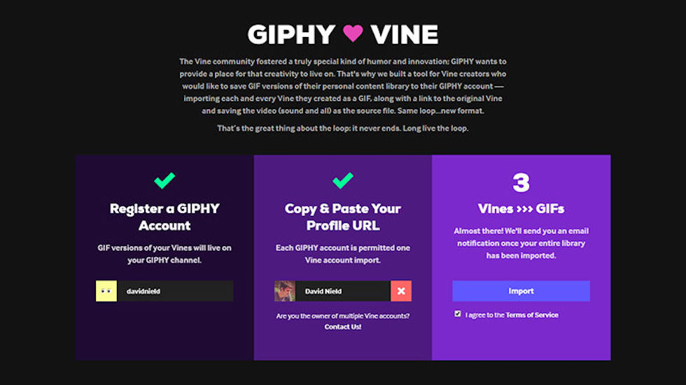 Il noto archivio di GIF animate Giphy ha attivato una pagina per trasformare i propri Vine in GIF. È sufficiente creare un account su Giphy e associarne uno su Vine: tutti i video presenti saranno trasformati in GIF e trasferiti su Giphy, dove potranno essere scaricati o condivisi (e cercati da altri utenti).