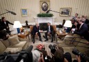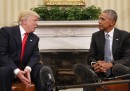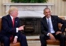 Giovedì pomeriggio, poco dopo le 17 ora italiana, Barack Obama ha incontrato per la prima volta Donald Trump dopo le elezioni di martedì: come da consuetudine il presidente in carica ha invitato il presidente eletto alla Casa Bianca per iniziare formalmente la transizione di poteri, che si concluderà il prossimo gennaio quando Trump giurerà da nuovo presidente e la sua amministrazione prenderà il posto della vecchia. L’incontro è durato più o meno un’ora e mezza. Poi Obama e Trump si sono stretti la mano e hanno parlato brevemente davanti ai giornalisti, ma non hanno risposto ad alcuna domanda.