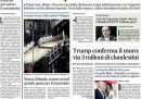 I giornali di oggi hanno notizie diverse in apertura: alcuni danno spazio alle dichiarazioni del neo presidente degli Stati Uniti Donald Trump, che in un’intervista televisiva ha confermato l’intenzione di costruire una barriera al confine con il Messico per contrastare l’arrivo di immigrati irregolari e di procedere all’espulsione dei clandestini nel paese, altri si occupano della campagna elettorale per il referendum costituzionale, altri ancora delle divisioni e dei movimenti nello schieramento di centrodestra, sui quali il Messaggero intervista il ministro dell’Interno Alfano.