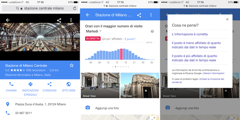 Da luglio 2015 quando si cerca un luogo su Google, che si tratti di un ristorante, di una stazione o di un museo, si può anche vedere quali sono gli orari della settimana in cui in media questi posti sono più affollati. Non si poteva quindi sapere “in diretta” se e quanto un ristorante fosse pieno, ma ora sì. Il servizio si chiama “Popular times” (in italiano “Orari con il maggior numero di visite”) e da ieri è stato arricchito con una funzione “Live”. Funziona sia sui dispositivi mobili che da computer, e gli utenti possono confermare o meno ciò che dicono i dati raccolti in tempo reale da Google, tracciando la posizione degli utenti in forma anonima.
