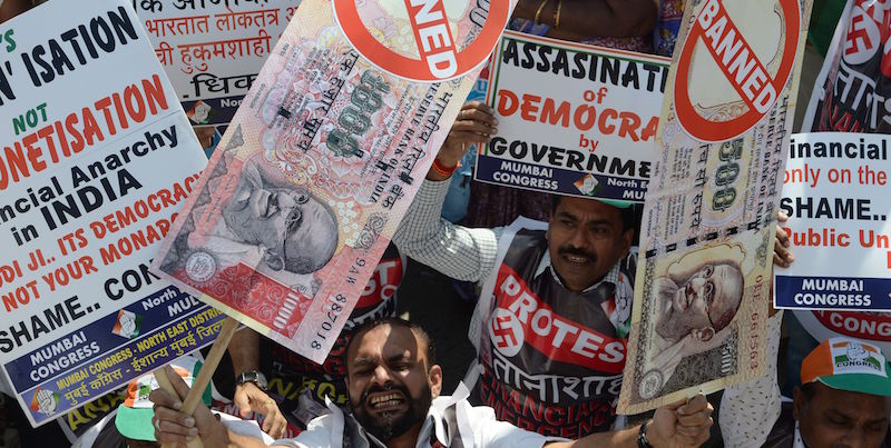La decisione del primo ministro indiano Narendra Modi di ritirare dalla circolazione le banconote da 500 e 1.000 rupie sta causando problemi alla popolazione indiana. Il provvedimento è stato annunciato a sorpresa l’8 novembre, con un discorso dello stesso Modi trasmesso in tv. L’obiettivo del governo è inasprire i controlli sul mercato nero, arginare la contraffazione, l’evasione fiscale e la corruzione, tutti problemi in qualche maniera amplificati dall’uso delle banconote da 500 a 1.000 rupie, molto diffuse nell’economia “sommersa” e piuttosto facili da falsificare. Il provvedimento ha avuto effetti immediati e molti esercizi pubblici hanno smesso da subito di accettare quel tipo di banconote. La decisione ha provocato però anche diverse conseguenze negative: l’economia indiana ne ha risentito e molte persone hanno organizzato manifestazioni e proteste contro il governo.
